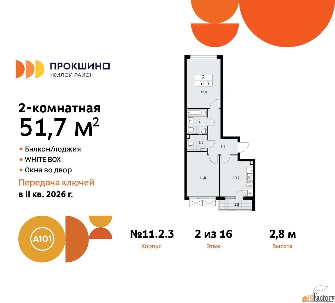 Дом монолитный, многоподъездный, переменной этажности, от 13 до 16 этажей. Квартира находится в 6-й секции высотой 16 этажей в корпусе 11.2.3. На этаже 5 квартир. В подъезде 1 пассажирский и 1 грузовой лифт. Начало строительства - 3 квартал 2023 года. Окончание строительства - 2 квартал 2026 года. Оформление сделки по договору долевого участия.