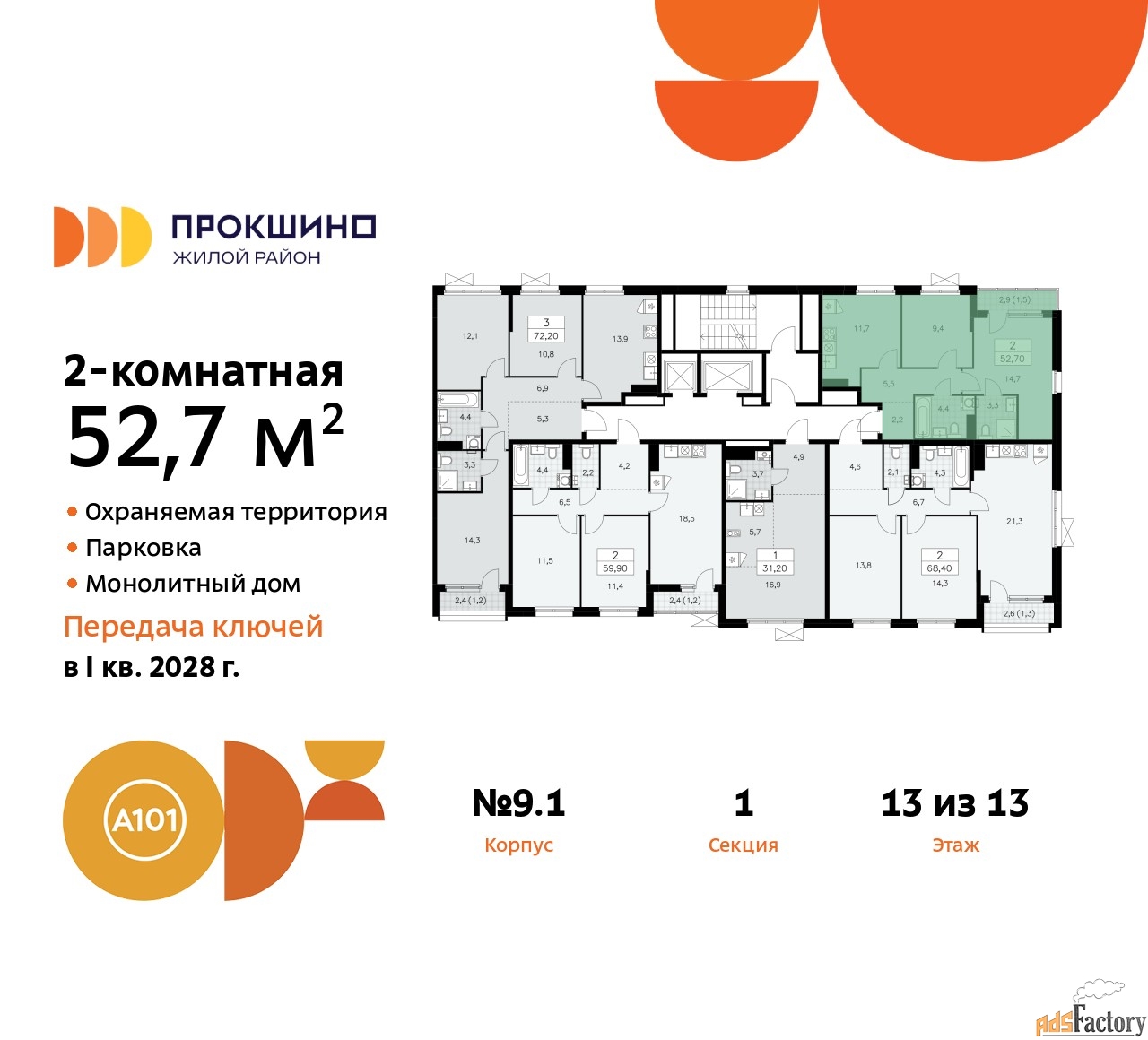 Дом монолитный, двухподъездный, высотой 13 этажей. Квартира находится в 1-й секции в корпусе 9.1. На этаже 5 квартир. В подъезде 1 пассажирский и 1 грузовой лифт. Начало строительства - 3 квартал 2025 года. Окончание строительства - 4 квартал 2027 года. Оформление сделки по договору долевого участия.