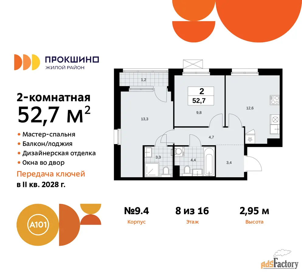 Дом монолитный, черырехподъездный, переменной этажности, от 10 до 16 этажей. Квартира находится в 4-й секции высотой 15 этажей в корпусе 9.4. На этаже 5 квартир. В подъезде 1 пассажирский и 1 грузовой лифт. Начало строительства - 3 квартал 2025 года. Окончание строительства - 4 квартал 2027 года. Оформление сделки по договору долевого участия.