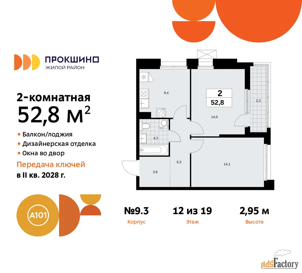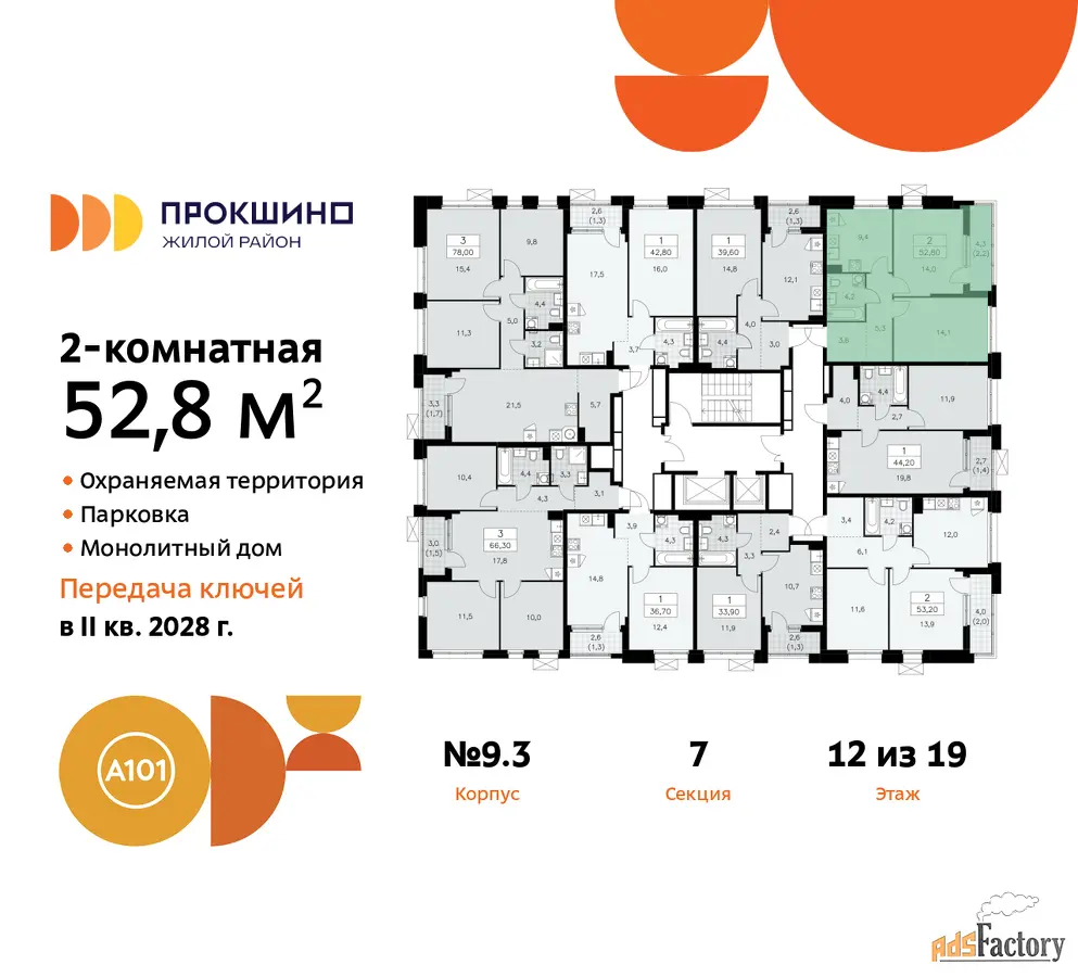 Квартира находится в корпусе 9.3. Дом монолитный, одноподъездный, высотой 19 этажей. На этаже 9 квартир. В подъезде 1 пассажирский и 1 грузовой лифт. Начало строительства - 3 квартал 2025 года. Окончание строительства - 4 квартал 2027 года. Оформление сделки по договору долевого участия.