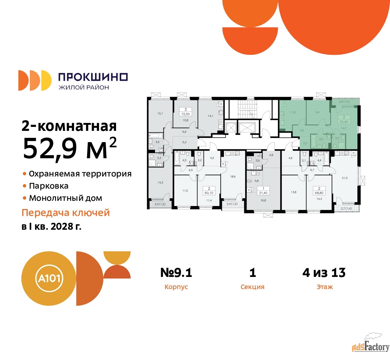 Дом монолитный, двухподъездный, высотой 13 этажей. Квартира находится в 1-й секции в корпусе 9.1. На этаже 5 квартир. В подъезде 1 пассажирский и 1 грузовой лифт. Начало строительства - 3 квартал 2025 года. Окончание строительства - 4 квартал 2027 года. Оформление сделки по договору долевого участия.