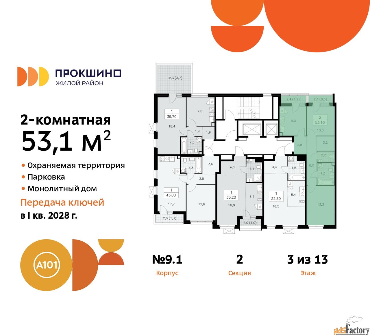 Дом монолитный, двухподъездный, высотой 13 этажей. Квартира находится во 2-й секции в корпусе 9.1. На этаже 5 квартир. В подъезде 1 пассажирский и 1 грузовой лифт. Начало строительства - 3 квартал 2025 года. Окончание строительства - 4 квартал 2027 года. Оформление сделки по договору долевого участия.