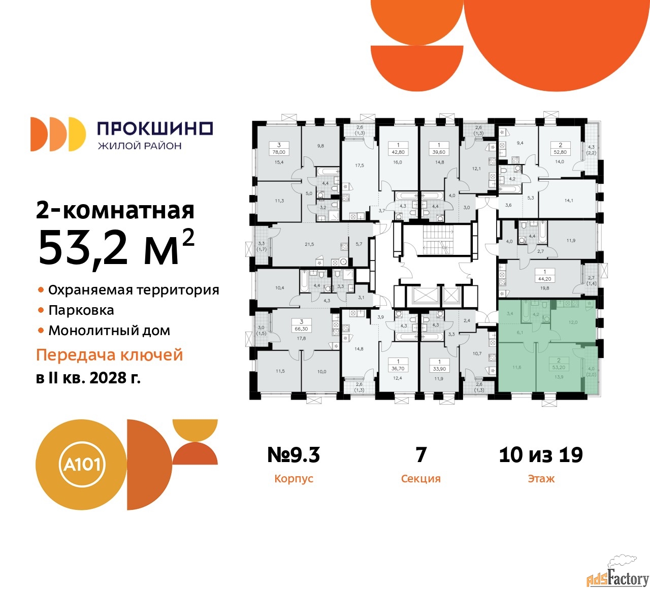 Квартира находится в корпусе 9.3. Дом монолитный, одноподъездный, высотой 19 этажей. На этаже 9 квартир. В подъезде 1 пассажирский и 1 грузовой лифт. Начало строительства - 3 квартал 2025 года. Окончание строительства - 4 квартал 2027 года. Оформление сделки по договору долевого участия.
