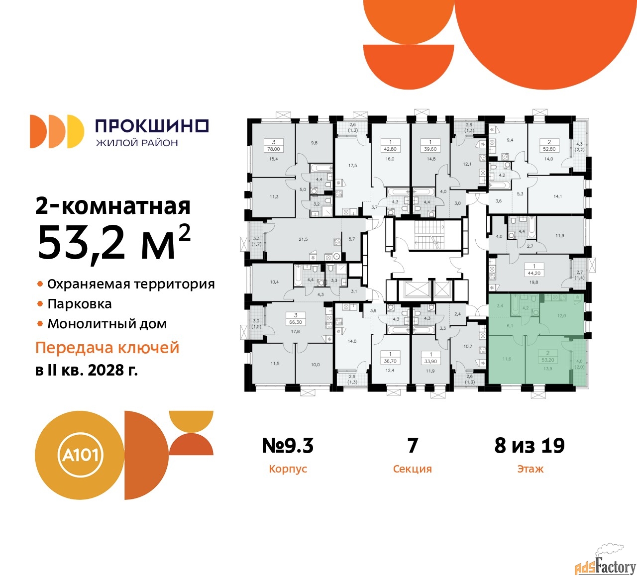 Квартира находится в корпусе 9.3. Дом монолитный, одноподъездный, высотой 19 этажей. На этаже 9 квартир. В подъезде 1 пассажирский и 1 грузовой лифт. Начало строительства - 3 квартал 2025 года. Окончание строительства - 4 квартал 2027 года. Оформление сделки по договору долевого участия.
