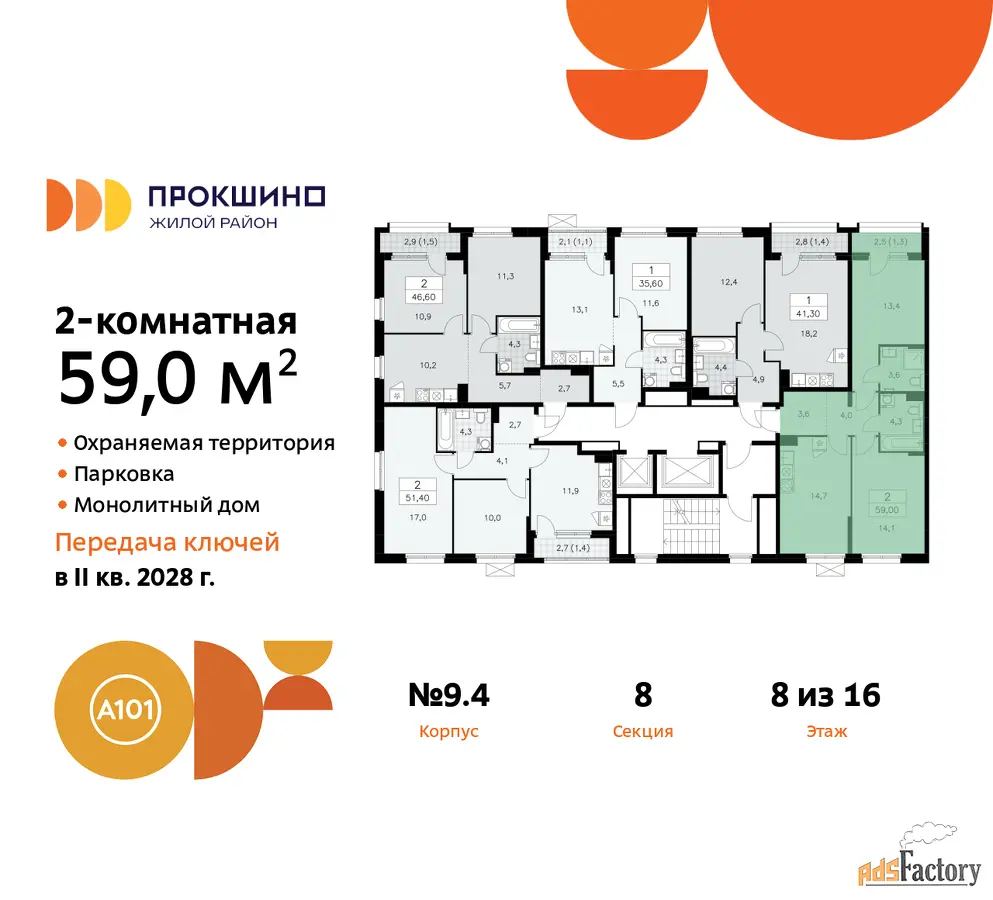 Дом монолитный, черырехподъездный, переменной этажности, от 10 до 16 этажей. Квартира находится в 1-й секции высотой 16 этажей в корпусе 9.4. На этаже 5 квартир. В подъезде 1 пассажирский и 1 грузовой лифт. Начало строительства - 3 квартал 2025 года. Окончание строительства - 4 квартал 2027 года. Оформление сделки по договору долевого участия.