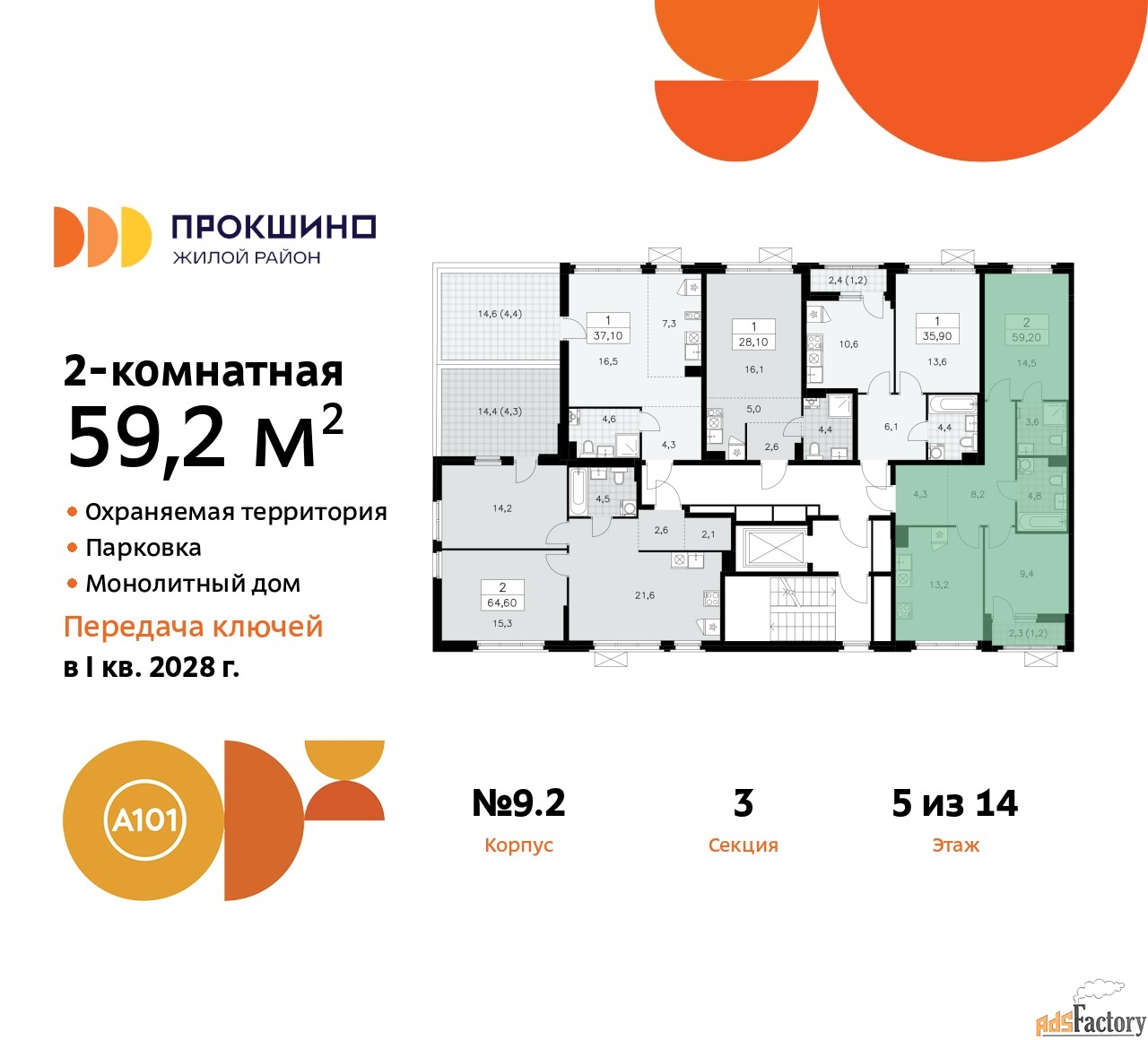Дом монолитный, черырехподъездный, переменной этажности, от 10 до 14 этажей. Квартира находится в 1-й секции высотой 10 этажей в корпусе 9.2. На этаже 5 квартир. В подъезде 1 грузовой лифт. Начало строительства - 3 квартал 2025 года. Окончание строительства - 4 квартал 2027 года. Оформление сделки по договору долевого участия.