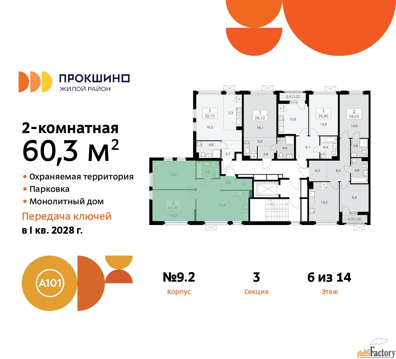 Дом монолитный, черырехподъездный, переменной этажности, от 10 до 14 этажей. Квартира находится в 1-й секции высотой 10 этажей в корпусе 9.2. На этаже 5 квартир. В подъезде 1 грузовой лифт. Начало строительства - 3 квартал 2025 года. Окончание строительства - 4 квартал 2027 года. Оформление сделки по договору долевого участия.