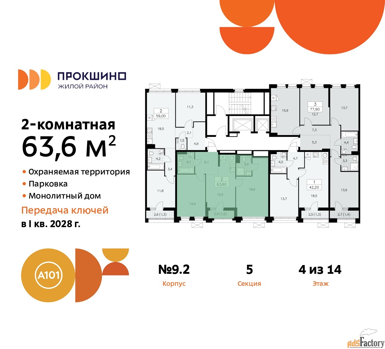 Дом монолитный, черырехподъездный, переменной этажности, от 10 до 14 этажей. Квартира находится в 3-й секции высотой 14 этажей в корпусе 9.2. На этаже 4 квартиры. В подъезде 1 пассажирский и 1 грузовой лифт. Начало строительства - 3 квартал 2025 года. Окончание строительства - 4 квартал 2027 года. Оформление сделки по договору долевого участия.