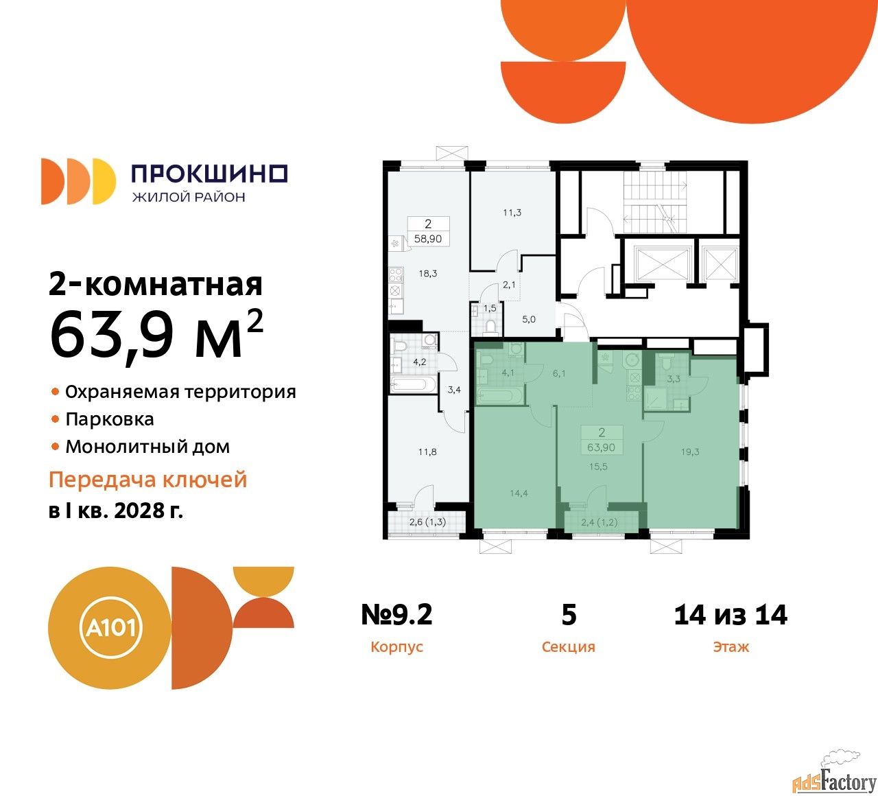 Дом монолитный, черырехподъездный, переменной этажности, от 10 до 14 этажей. Квартира находится в 3-й секции высотой 14 этажей в корпусе 9.2. На этаже 4 квартиры. В подъезде 1 пассажирский и 1 грузовой лифт. Начало строительства - 3 квартал 2025 года. Окончание строительства - 4 квартал 2027 года. Оформление сделки по договору долевого участия.