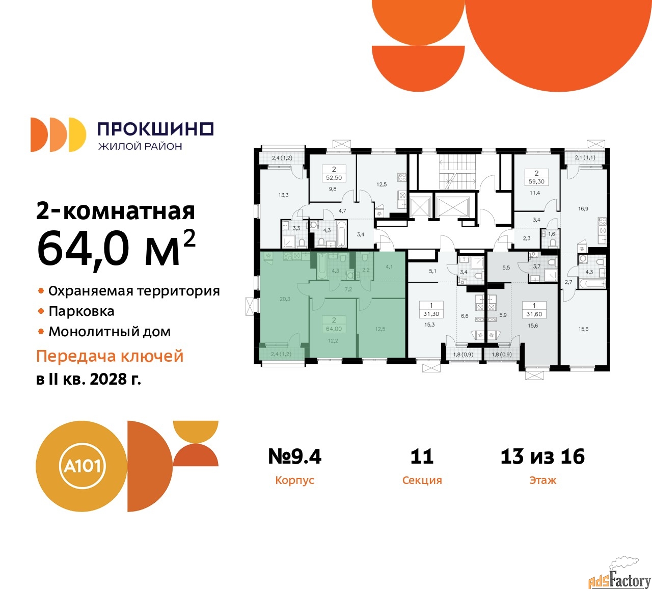 Дом монолитный, черырехподъездный, переменной этажности, от 10 до 16 этажей. Квартира находится в 4-й секции высотой 15 этажей в корпусе 9.4. На этаже 5 квартир. В подъезде 1 пассажирский и 1 грузовой лифт. Начало строительства - 3 квартал 2025 года. Окончание строительства - 4 квартал 2027 года. Оформление сделки по договору долевого участия.