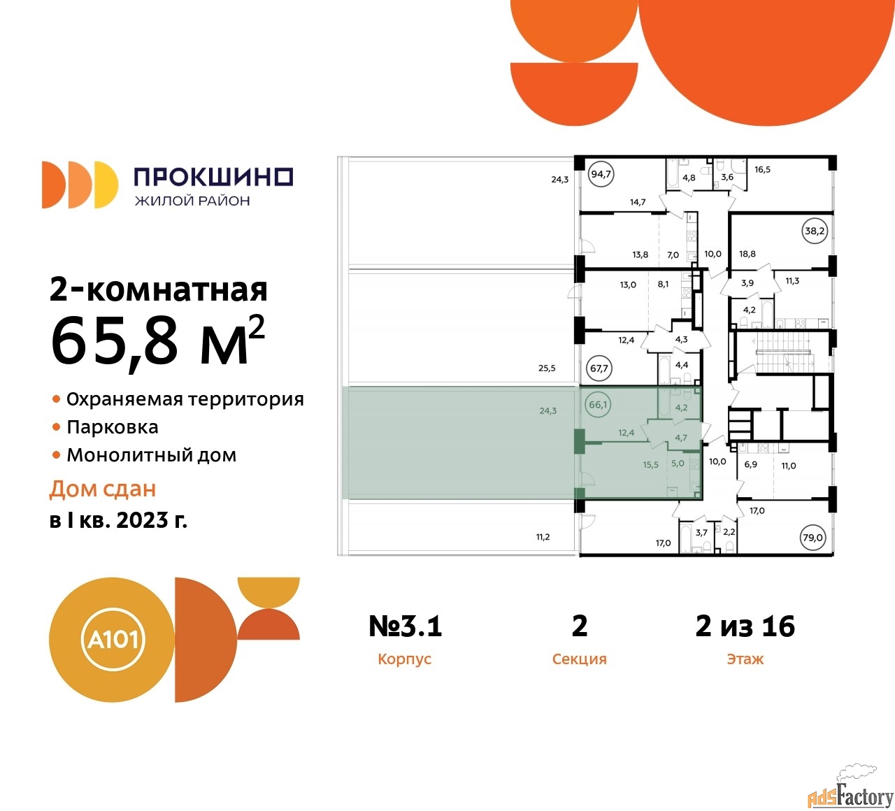 ЖК «Прокшино» расположен в 7,6 км от МКАД в Новой Москве. В 8 минутах пешком находится станция метро «Прокшино» быстрой и комфортной красной линии метро. Высокую транспортную доступность обеспечивают и два крупных шоссе, до которых легко доехать за 5 минут по новой скоростной автотрассе Солнцево – Бутово – Варшавское шоссе. Жилой комплекс «Прокшино» входит в кластер Прокшино. В районе появятся дома комфорт и бизнес-класса с подземным паркингом, закрытыми благоустроенными дворами без машин, местами для активного и созерцательного отдыха, магазинами, бытовыми сервисами и другими коммерческими объектами. Рядом пруд с собственной набережной и городской парк «Хованская дубрава». Для маленьких жителей построят детские сады, образовательный комплекс. (AQID01940475)