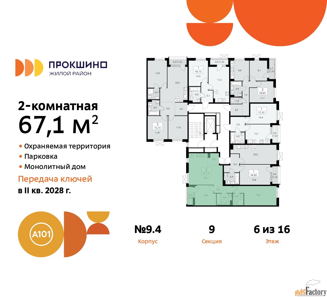 Дом монолитный, черырехподъездный, переменной этажности, от 10 до 16 этажей. Квартира находится во 2-й секции высотой 10 этажей в корпусе 9.4. На этаже 6 квартир. В подъезде 1 грузовой лифт. Начало строительства - 3 квартал 2025 года. Окончание строительства - 4 квартал 2027 года. Оформление сделки по договору долевого участия.