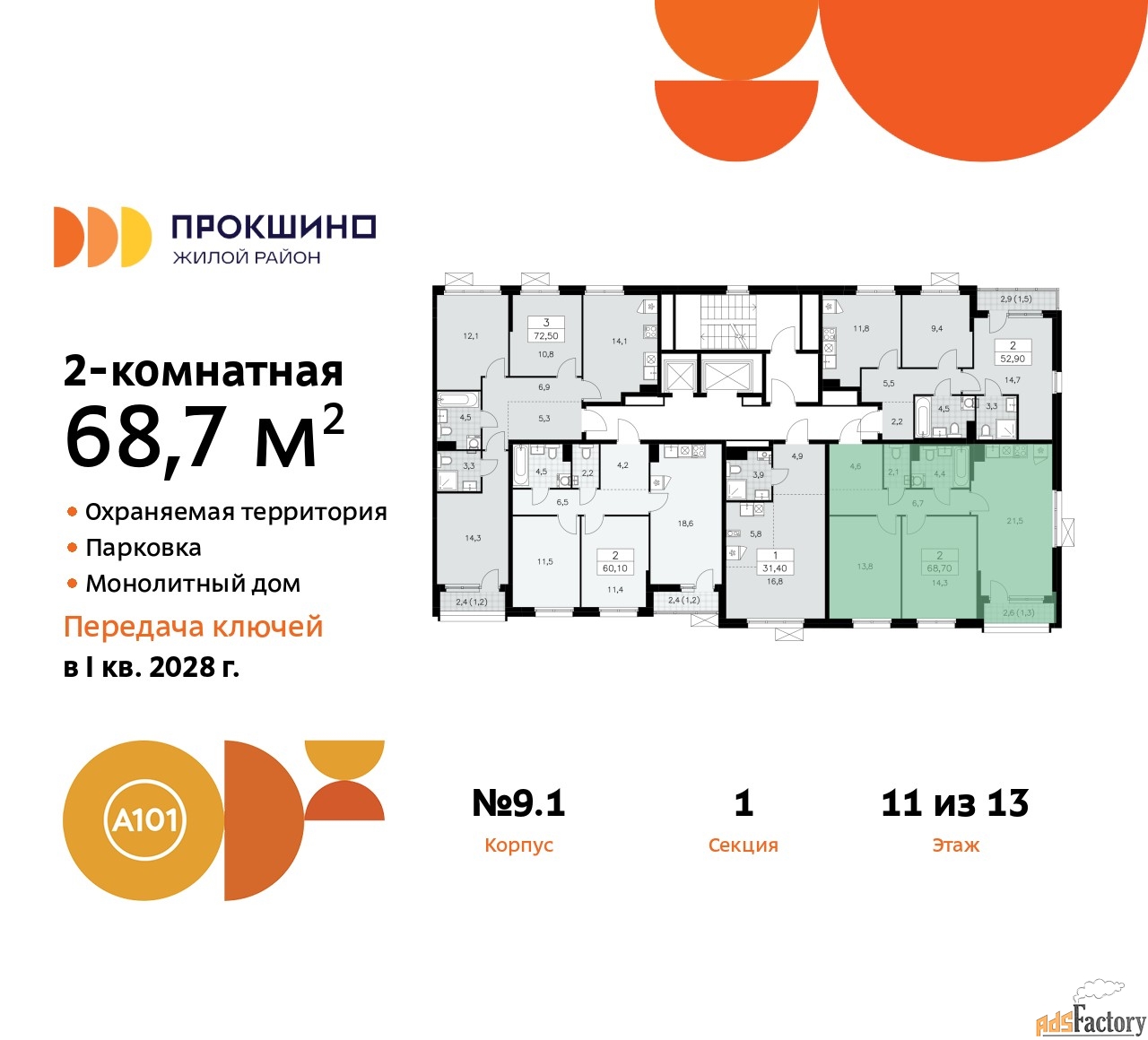 Дом монолитный, двухподъездный, высотой 13 этажей. Квартира находится в 1-й секции в корпусе 9.1. На этаже 5 квартир. В подъезде 1 пассажирский и 1 грузовой лифт. Начало строительства - 3 квартал 2025 года. Окончание строительства - 4 квартал 2027 года. Оформление сделки по договору долевого участия.