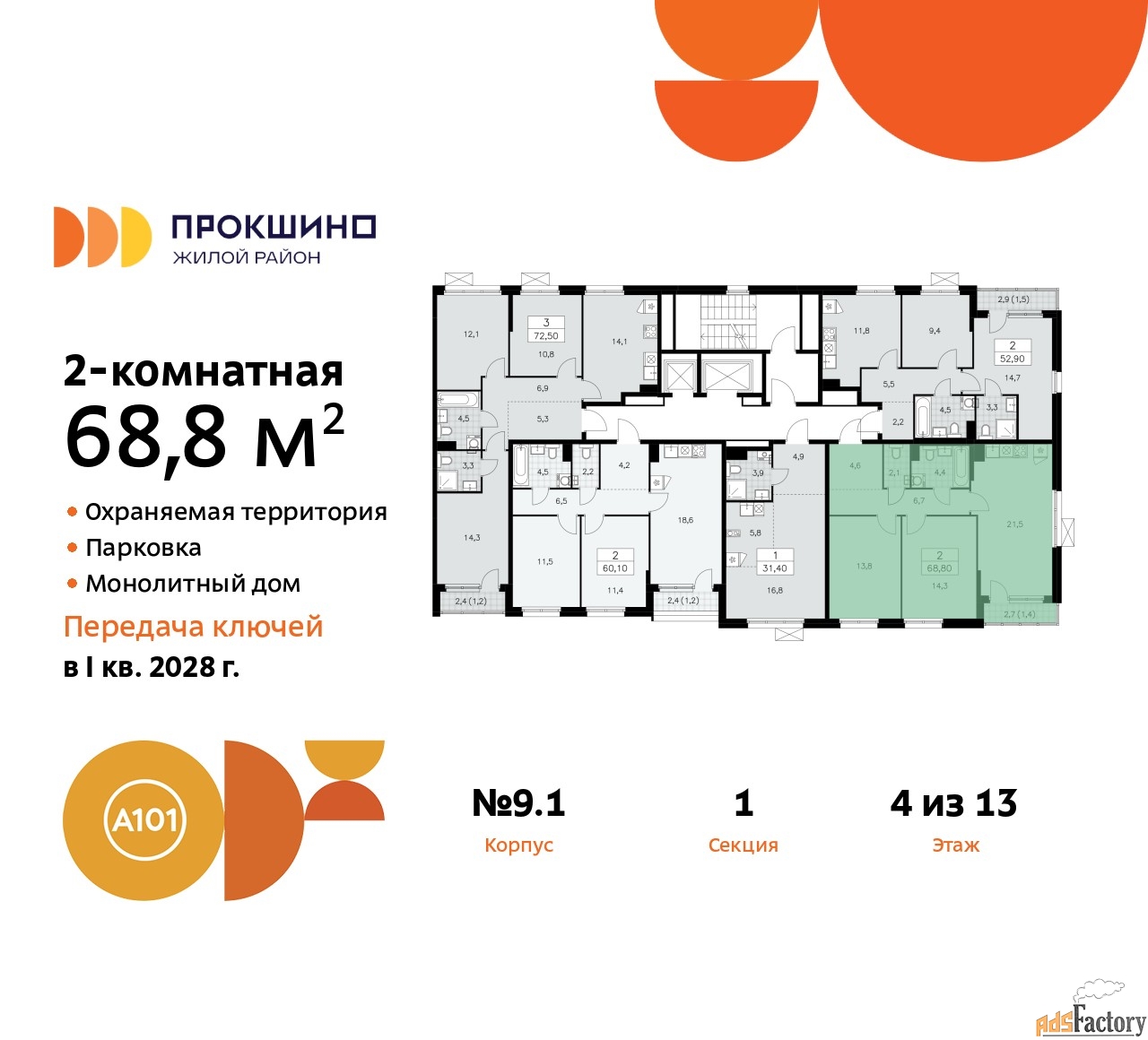 Дом монолитный, двухподъездный, высотой 13 этажей. Квартира находится в 1-й секции в корпусе 9.1. На этаже 5 квартир. В подъезде 1 пассажирский и 1 грузовой лифт. Начало строительства - 3 квартал 2025 года. Окончание строительства - 4 квартал 2027 года. Оформление сделки по договору долевого участия.