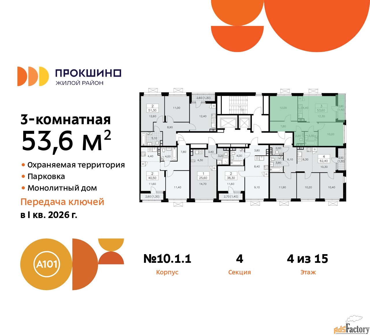 Дом монолитный, черырехподъездный, высотой 15 этажей. Квартира находится в 4-й секции в корпусе 10.1.1. На этаже 6 квартир. В подъезде 1 пассажирский и 1 грузовой лифт. Начало строительства - 2 квартал 2023 года. Окончание строительства - 1 квартал 2026 года. Оформление сделки по договору долевого участия.