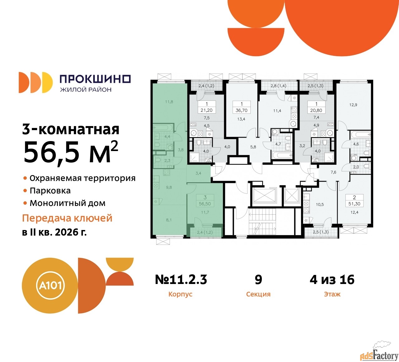 Дом монолитный, многоподъездный, переменной этажности, от 13 до 16 этажей. Квартира находится в 4-й секции высотой 16 этажей в корпусе 11.2.3. На этаже 5 квартир. В подъезде 1 пассажирский и 1 грузовой лифт. Начало строительства - 3 квартал 2023 года. Окончание строительства - 2 квартал 2026 года. Оформление сделки по договору долевого участия.