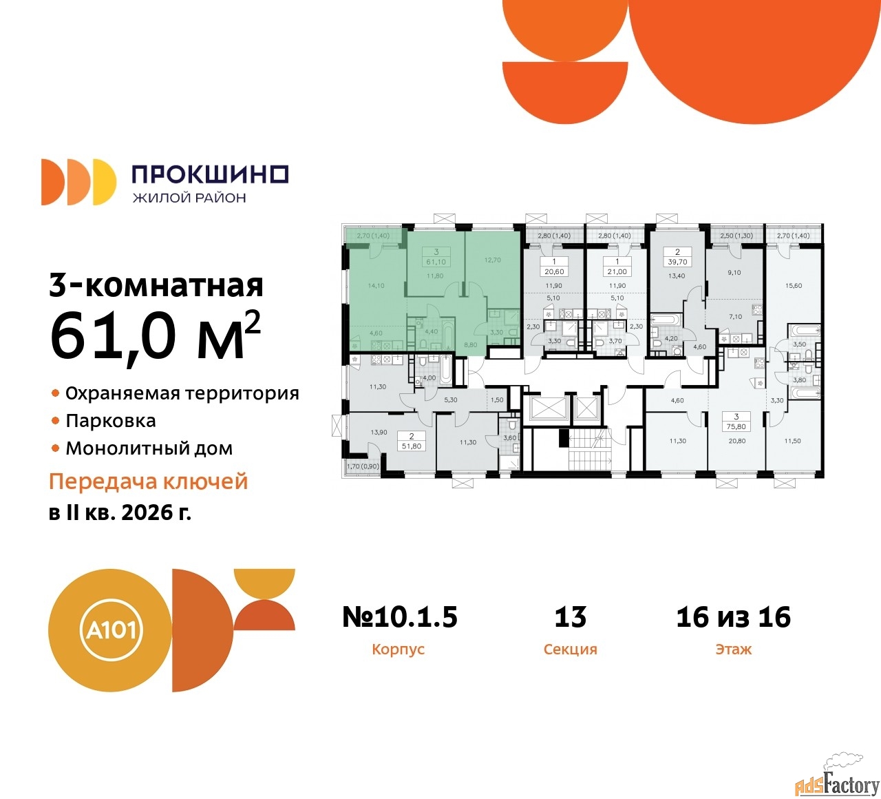 Дом монолитный, многоподъездный, переменной этажности, от 7 до 16 этажей. Квартира находится в 1-й секции высотой 16 этажей в корпусе 10.1.5. На этаже 6 квартир. В подъезде 1 пассажирский и 1 грузовой лифт. Начало строительства - 2 квартал 2023 года. Окончание строительства - 2 квартал 2026 года. Оформление сделки по договору долевого участия.