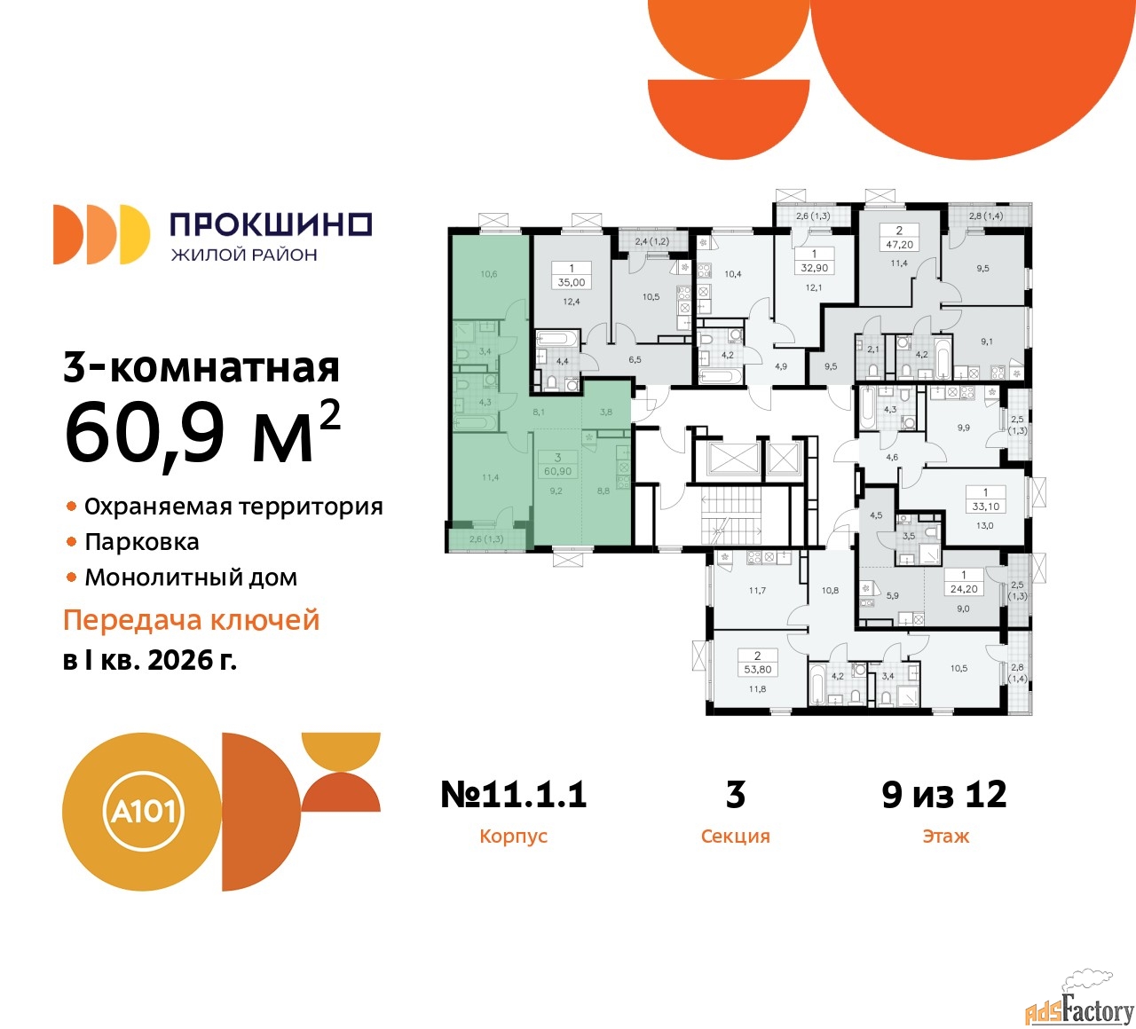Дом монолитный, трехподъездный, высотой 12 этажей. Квартира находится в 3-й секции в корпусе 11.1.1. На этаже 7 квартир. В подъезде 1 пассажирский и 1 грузовой лифт. Начало строительства - 3 квартал 2023 года. Окончание строительства - 1 квартал 2026 года. Оформление сделки по договору долевого участия.