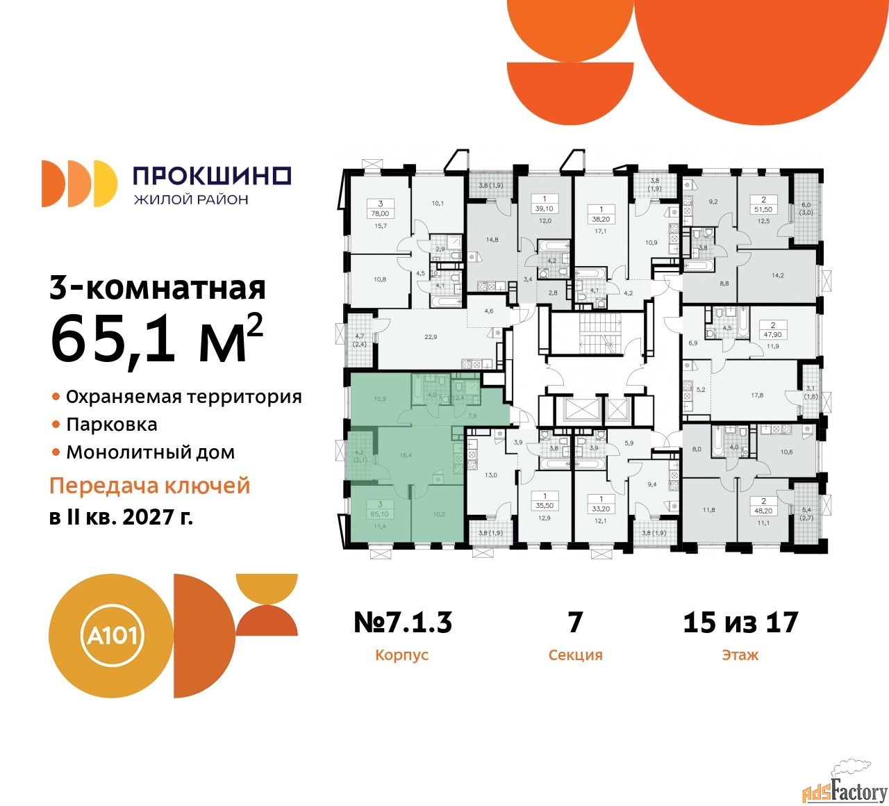 Квартира находится в корпусе 7.1.3. Дом монолитный, одноподъездный, высотой 17 этажей. На этаже 9 квартир. В подъезде 1 пассажирский и 1 грузовой лифт. Начало строительства - 4 квартал 2024 года. Окончание строительства - 2 квартал 2027 года. Оформление сделки по договору долевого участия.