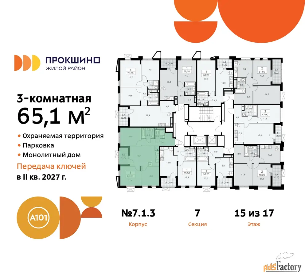 Квартира находится в корпусе 7.1.3. Дом монолитный, одноподъездный, высотой 17 этажей. На этаже 9 квартир. В подъезде 1 пассажирский и 1 грузовой лифт. Начало строительства - 4 квартал 2024 года. Окончание строительства - 2 квартал 2027 года. Оформление сделки по договору долевого участия.
