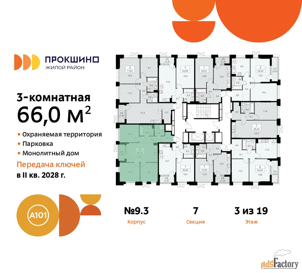 Квартира находится в корпусе 9.3. Дом монолитный, одноподъездный, высотой 19 этажей. На этаже 9 квартир. В подъезде 1 пассажирский и 1 грузовой лифт. Начало строительства - 3 квартал 2025 года. Окончание строительства - 4 квартал 2027 года. Оформление сделки по договору долевого участия.
