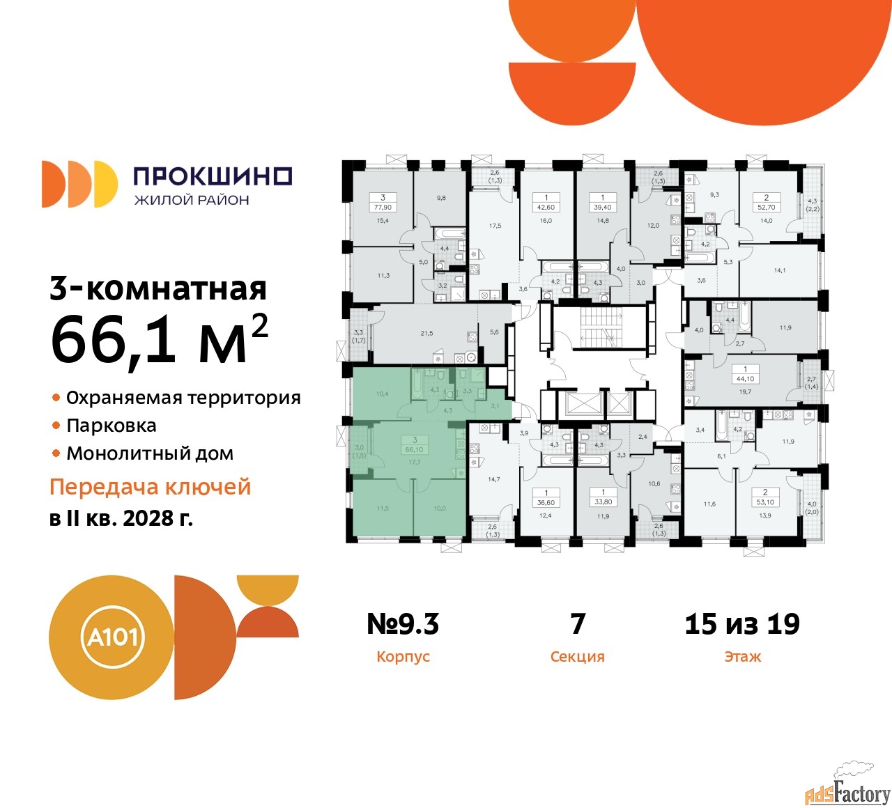 Квартира находится в корпусе 9.3. Дом монолитный, одноподъездный, высотой 19 этажей. На этаже 9 квартир. В подъезде 1 пассажирский и 1 грузовой лифт. Начало строительства - 3 квартал 2025 года. Окончание строительства - 4 квартал 2027 года. Оформление сделки по договору долевого участия.