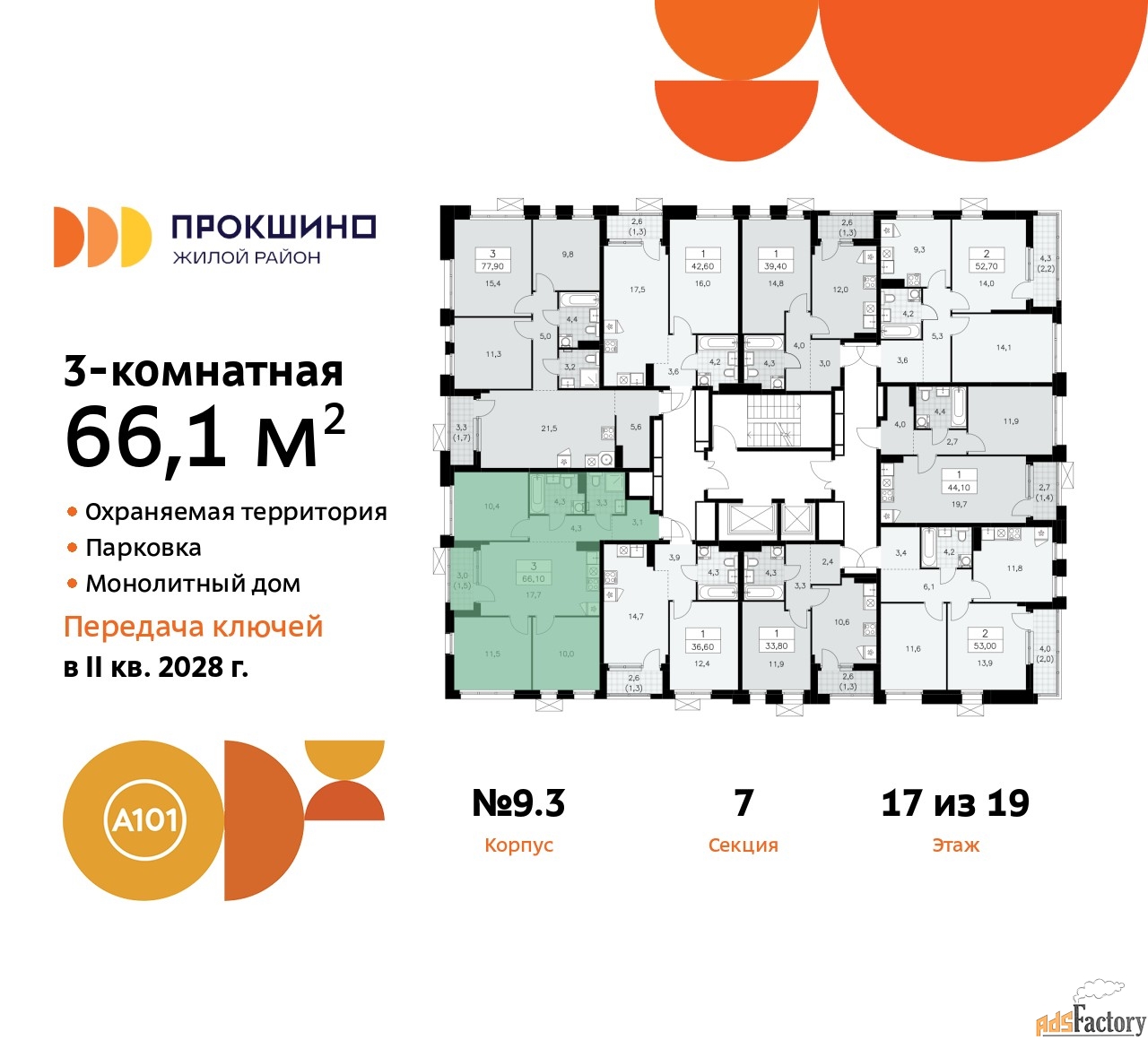 Квартира находится в корпусе 9.3. Дом монолитный, одноподъездный, высотой 19 этажей. На этаже 9 квартир. В подъезде 1 пассажирский и 1 грузовой лифт. Начало строительства - 3 квартал 2025 года. Окончание строительства - 4 квартал 2027 года. Оформление сделки по договору долевого участия.