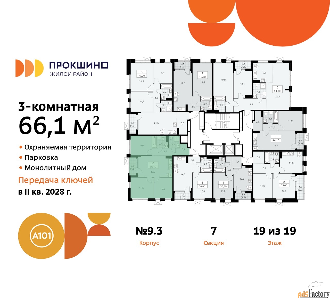 Квартира находится в корпусе 9.3. Дом монолитный, одноподъездный, высотой 19 этажей. На этаже 9 квартир. В подъезде 1 пассажирский и 1 грузовой лифт. Начало строительства - 3 квартал 2025 года. Окончание строительства - 4 квартал 2027 года. Оформление сделки по договору долевого участия.