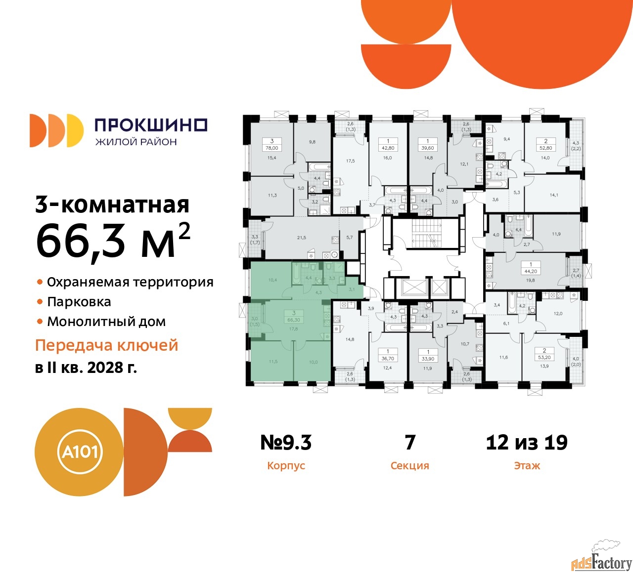 Квартира находится в корпусе 9.3. Дом монолитный, одноподъездный, высотой 19 этажей. На этаже 9 квартир. В подъезде 1 пассажирский и 1 грузовой лифт. Начало строительства - 3 квартал 2025 года. Окончание строительства - 4 квартал 2027 года. Оформление сделки по договору долевого участия.