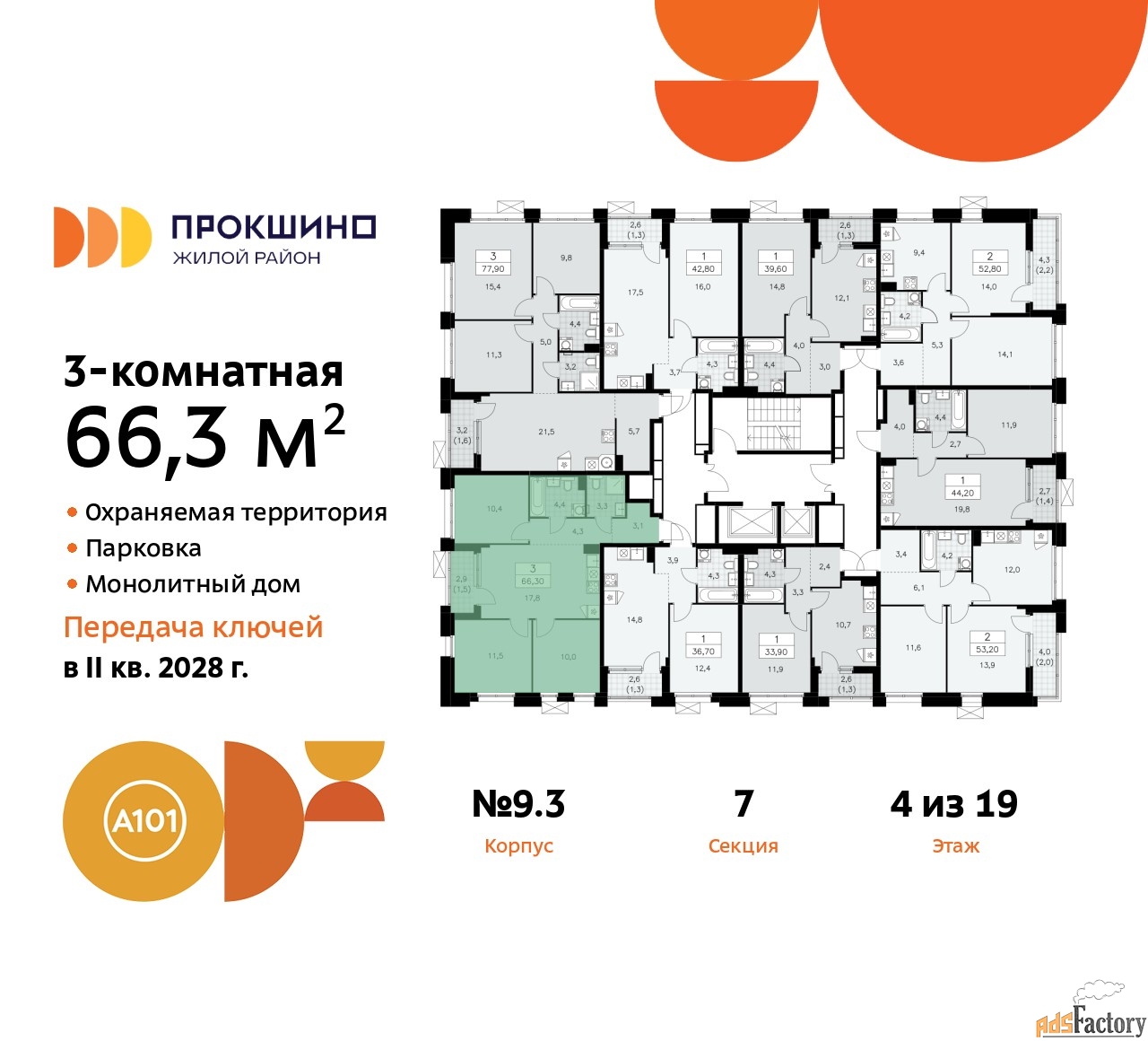 Квартира находится в корпусе 9.3. Дом монолитный, одноподъездный, высотой 19 этажей. На этаже 9 квартир. В подъезде 1 пассажирский и 1 грузовой лифт. Начало строительства - 3 квартал 2025 года. Окончание строительства - 4 квартал 2027 года. Оформление сделки по договору долевого участия.
