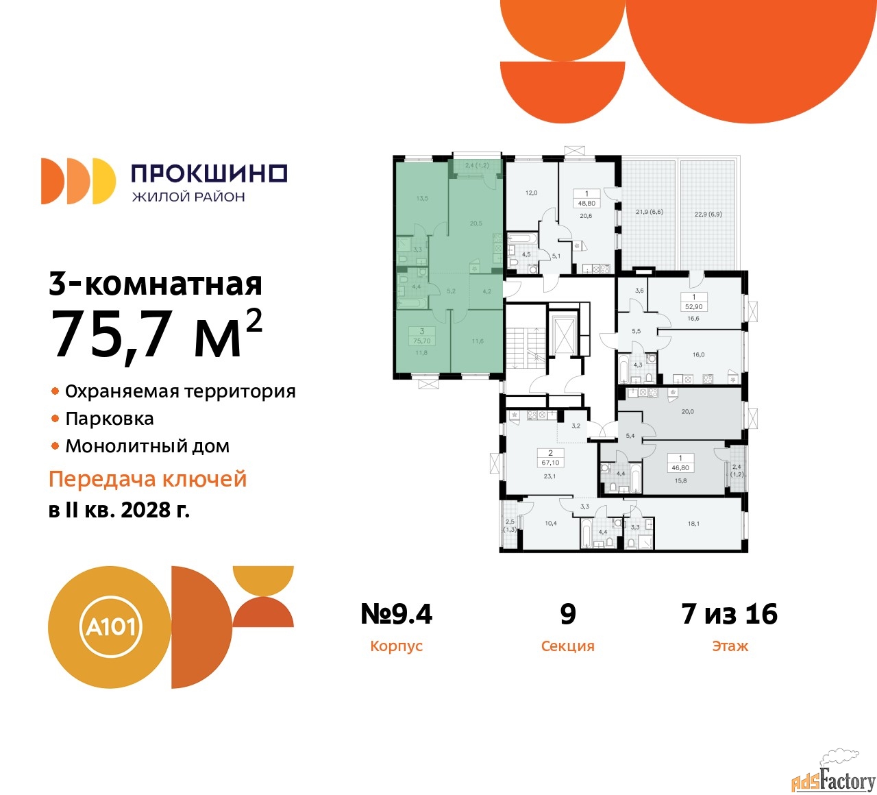 ЖК «Прокшино» расположен в 7,6 км от МКАД в Новой Москве. В 8 минутах пешком находится станция метро «Прокшино» быстрой и комфортной красной линии метро. Высокую транспортную доступность обеспечивают и два крупных шоссе, до которых легко доехать за 5 минут по новой скоростной автотрассе Солнцево – Бутово – Варшавское шоссе. Жилой комплекс «Прокшино» входит в кластер Прокшино. В районе появятся дома комфорт и бизнес-класса с подземным паркингом, закрытыми благоустроенными дворами без машин, местами для активного и созерцательного отдыха, магазинами, бытовыми сервисами и другими коммерческими объектами. Рядом пруд с собственной набережной и городской парк «Хованская дубрава». Для маленьких жителей построят детские сады, образовательный комплекс. (AQID02508860)