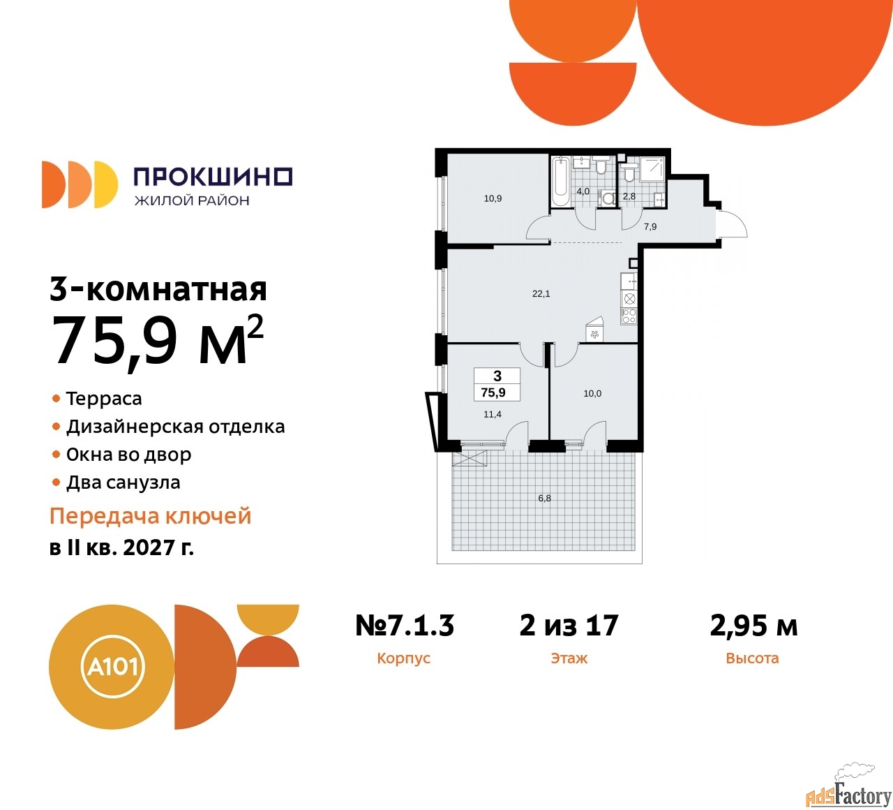 Квартира находится в корпусе 7.1.3. Дом монолитный, одноподъездный, высотой 17 этажей. На этаже 9 квартир. В подъезде 1 пассажирский и 1 грузовой лифт. Начало строительства - 4 квартал 2024 года. Окончание строительства - 2 квартал 2027 года. Оформление сделки по договору долевого участия.