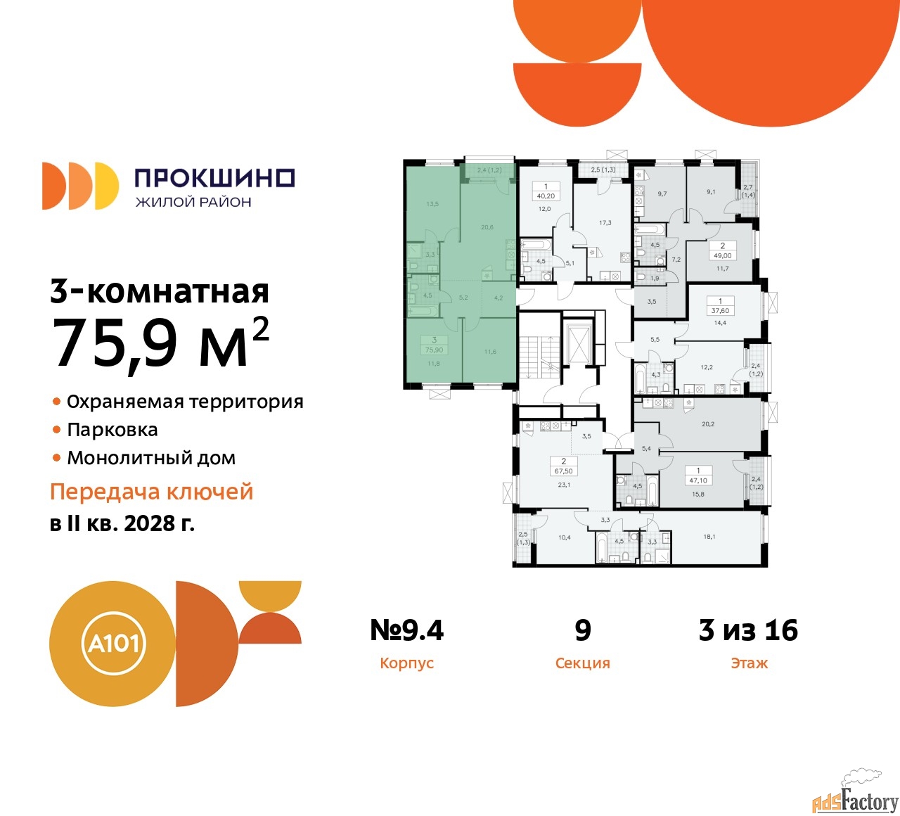 Дом монолитный, черырехподъездный, переменной этажности, от 10 до 16 этажей. Квартира находится во 2-й секции высотой 10 этажей в корпусе 9.4. На этаже 6 квартир. В подъезде 1 грузовой лифт. Начало строительства - 3 квартал 2025 года. Окончание строительства - 4 квартал 2027 года. Оформление сделки по договору долевого участия.