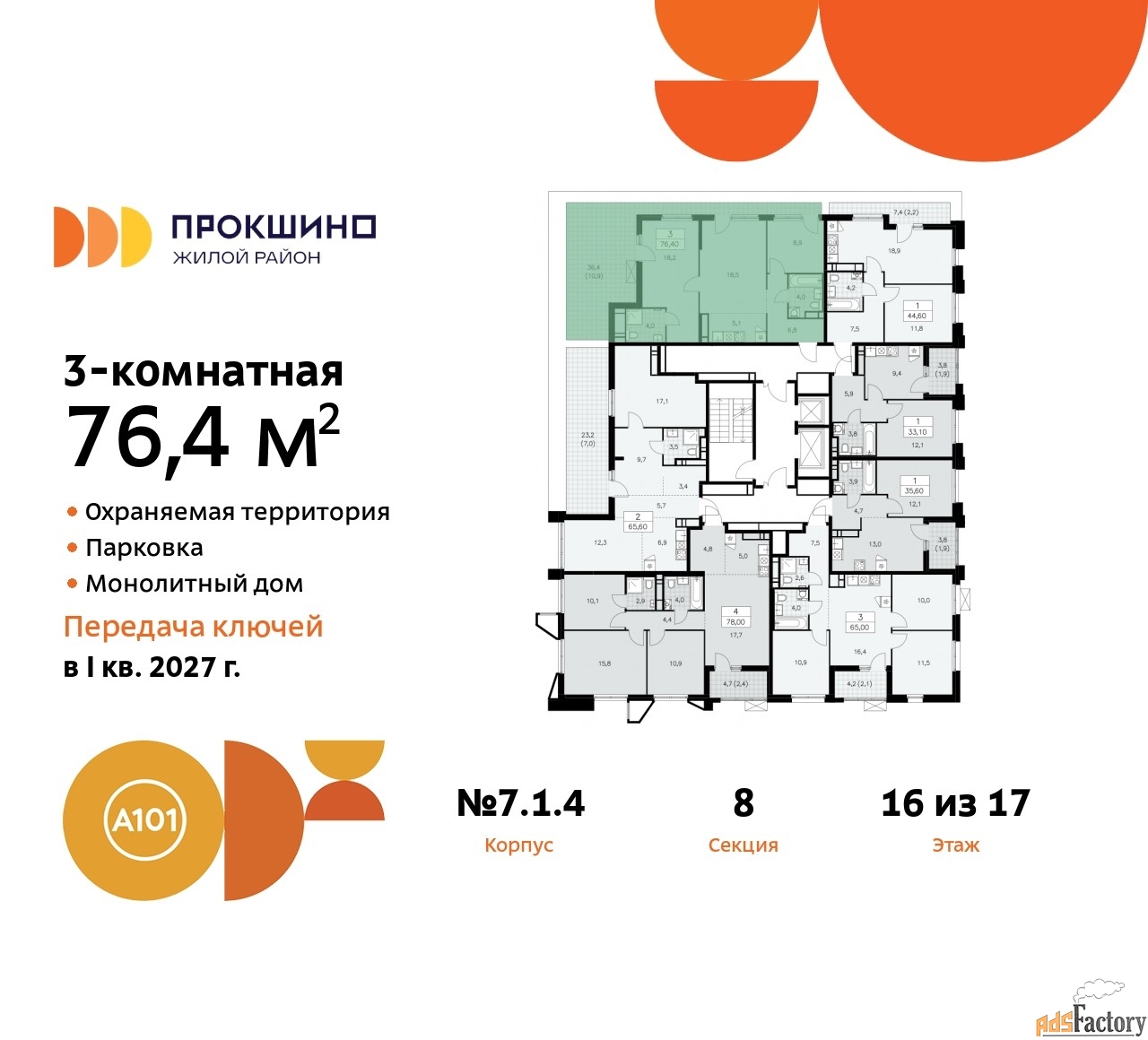 Квартира находится в корпусе 7.1.4. Дом монолитный, одноподъездный, высотой 17 этажей. На этаже 9 квартир. В подъезде 1 пассажирский и 1 грузовой лифт. Начало строительства - 4 квартал 2024 года. Окончание строительства - 1 квартал 2027 года. Оформление сделки по договору долевого участия.