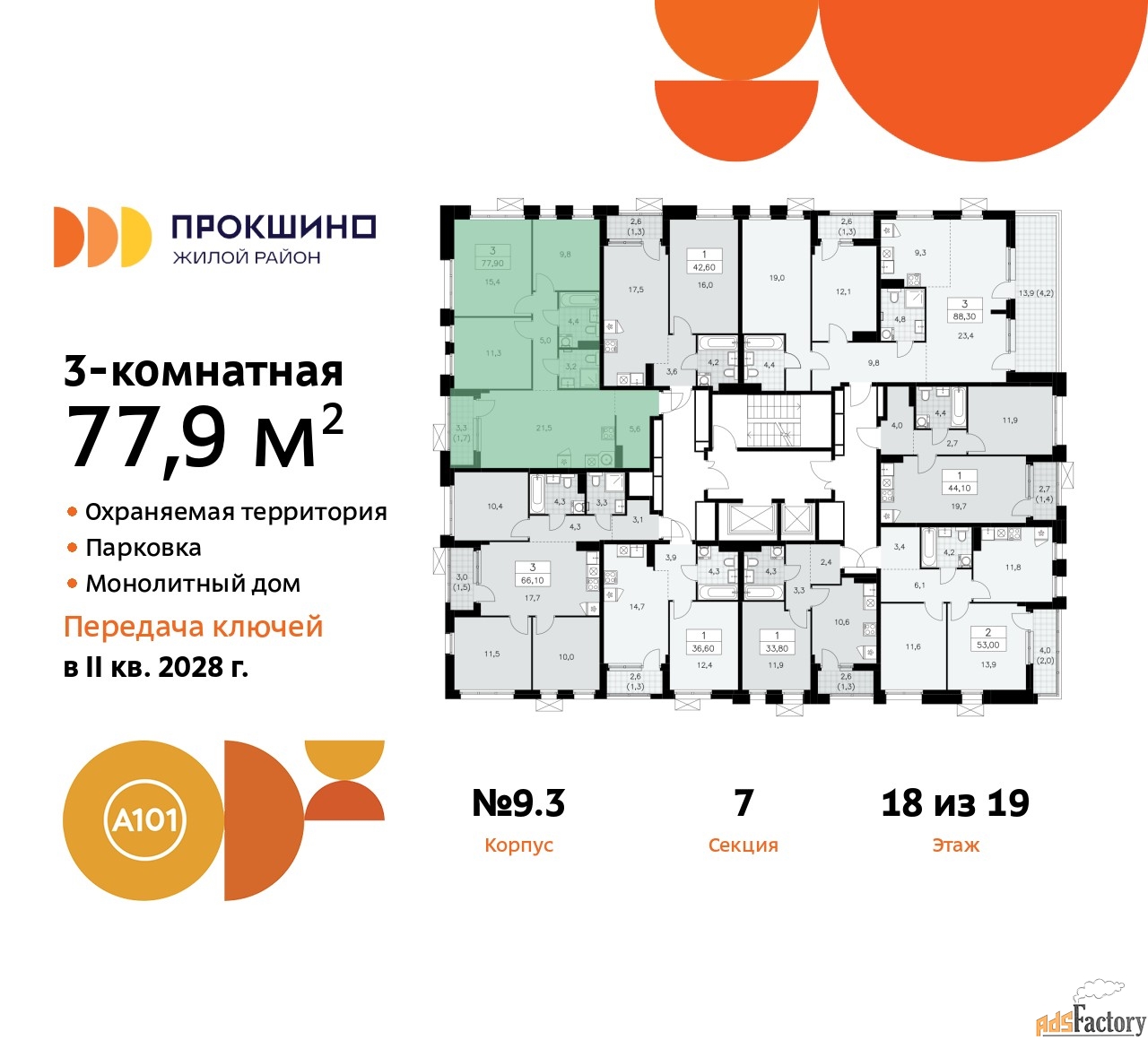 Квартира находится в корпусе 9.3. Дом монолитный, одноподъездный, высотой 19 этажей. На этаже 9 квартир. В подъезде 1 пассажирский и 1 грузовой лифт. Начало строительства - 3 квартал 2025 года. Окончание строительства - 4 квартал 2027 года. Оформление сделки по договору долевого участия.