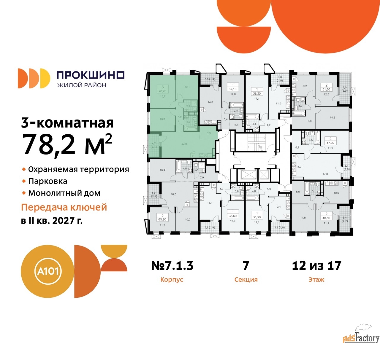 Квартира находится в корпусе 7.1.3. Дом монолитный, одноподъездный, высотой 17 этажей. На этаже 9 квартир. В подъезде 1 пассажирский и 1 грузовой лифт. Начало строительства - 4 квартал 2024 года. Окончание строительства - 2 квартал 2027 года. Оформление сделки по договору долевого участия.