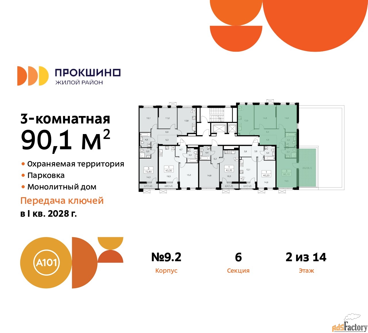 Дом монолитный, черырехподъездный, переменной этажности, от 10 до 14 этажей. Квартира находится в 4-й секции высотой 10 этажей в корпусе 9.2. На этаже 5 квартир. В подъезде 1 пассажирский и 1 грузовой лифт. Начало строительства - 3 квартал 2025 года. Окончание строительства - 4 квартал 2027 года. Оформление сделки по договору долевого участия.