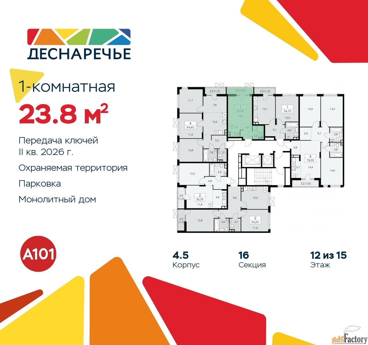 Дом монолитный, черырехподъездный, переменной этажности, от 12 до 15 этажей. Квартира находится в 3-й секции высотой 12 этажей в корпусе 4.5. На этаже 6 квартир. В подъезде 1 пассажирский и 1 грузовой лифт. Начало строительства - 3 квартал 2023 года. Окончание строительства - 2 квартал 2026 года. Оформление сделки по договору долевого участия.