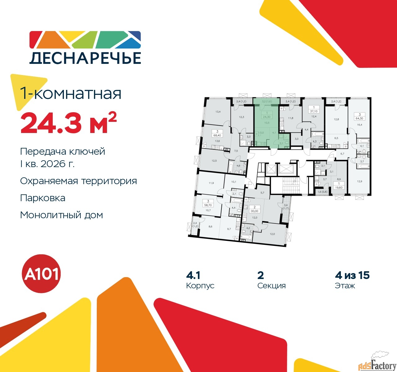 Дом монолитный, трехподъездный, высотой 15 этажей. Квартира находится во 2-й секции в корпусе 4.1. На этаже 7 квартир. В подъезде 1 пассажирский и 1 грузовой лифт. Начало строительства - 3 квартал 2023 года. Окончание строительства - 1 квартал 2026 года. Оформление сделки по договору долевого участия.