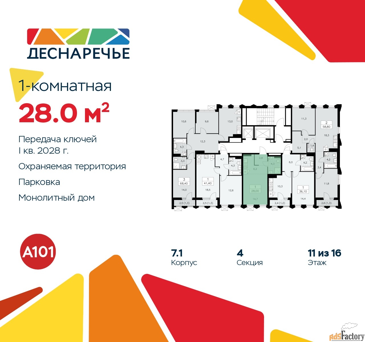 Дом монолитный, многоподъездный, переменной этажности, от 8 до 16 этажей. Квартира находится в 4-й секции высотой 11 этажей в корпусе 7.1. На этаже 5 квартир. В подъезде 1 пассажирский и 1 грузовой лифт. Начало строительства - 2 квартал 2025 года. Окончание строительства - 1 квартал 2028 года. Оформление сделки по договору долевого участия.