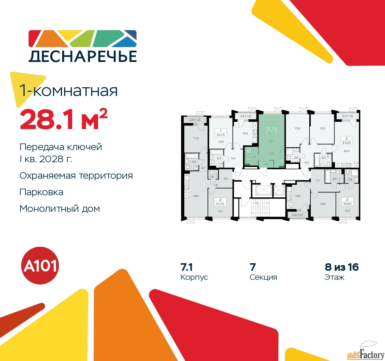 Дом монолитный, многоподъездный, переменной этажности, от 8 до 16 этажей. Квартира находится в 7-й секции высотой 11 этажей в корпусе 7.1. На этаже 5 квартир. В подъезде 1 пассажирский и 1 грузовой лифт. Начало строительства - 2 квартал 2025 года. Окончание строительства - 1 квартал 2028 года. Оформление сделки по договору долевого участия.