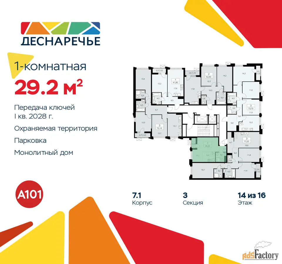 Дом монолитный, многоподъездный, переменной этажности, от 8 до 16 этажей. Квартира находится в 3-й секции высотой 14 этажей в корпусе 7.1. На этаже 6 квартир. В подъезде 1 пассажирский и 1 грузовой лифт. Начало строительства - 2 квартал 2025 года. Окончание строительства - 1 квартал 2028 года. Оформление сделки по договору долевого участия.