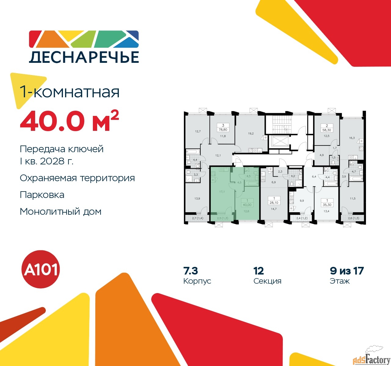 Дом монолитный, черырехподъездный, переменной этажности, от 9 до 17 этажей. Квартира находится во 2-й секции высотой 9 этажей в корпусе 7.3. На этаже 5 квартир. В подъезде 1 пассажирский и 1 грузовой лифт. Начало строительства - 2 квартал 2025 года. Окончание строительства - 1 квартал 2028 года. Оформление сделки по договору долевого участия.