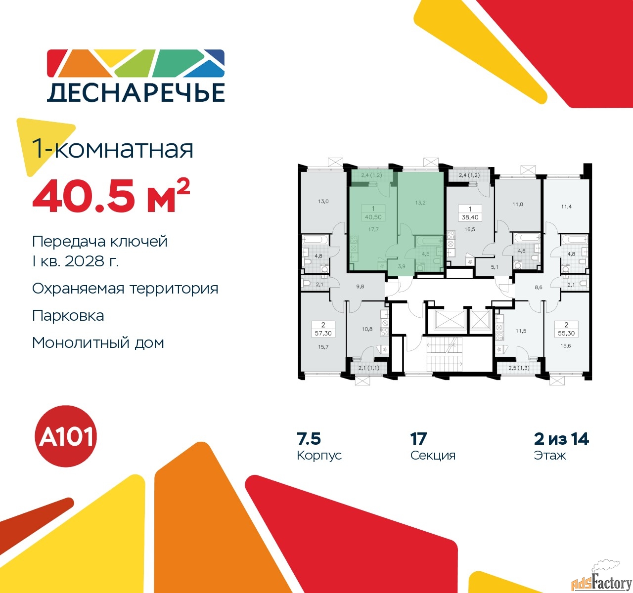 Дом монолитный, трехподъездный, переменной этажности, от 11 до 17 этажей. Квартира находится во 2-й секции высотой 17 этажей в корпусе 7.5. На этаже 4 квартиры. В подъезде 1 пассажирский и 1 грузовой лифт. Начало строительства - 2 квартал 2025 года. Окончание строительства - 1 квартал 2028 года. Оформление сделки по договору долевого участия.