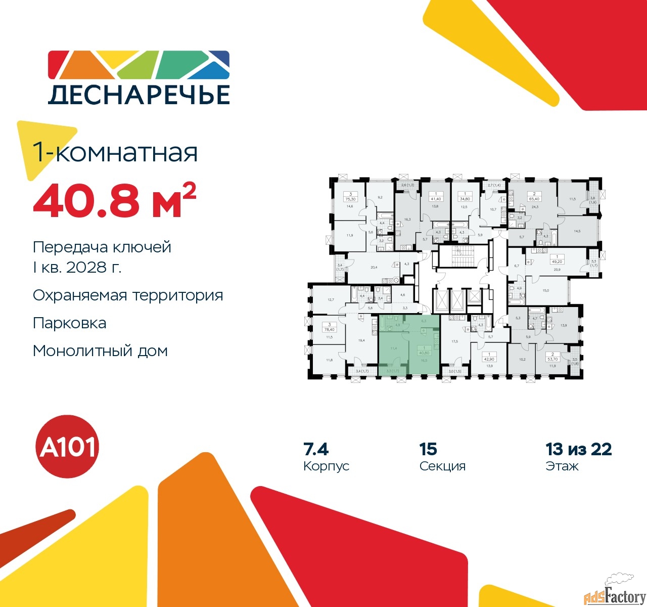 Квартира находится в корпусе 7.4. Дом монолитный, одноподъездный, высотой 22 этажа. На этаже 9 квартир. В подъезде 1 пассажирский и 2 грузовых лифта. Начало строительства - 2 квартал 2025 года. Окончание строительства - 1 квартал 2028 года. Оформление сделки по договору долевого участия.