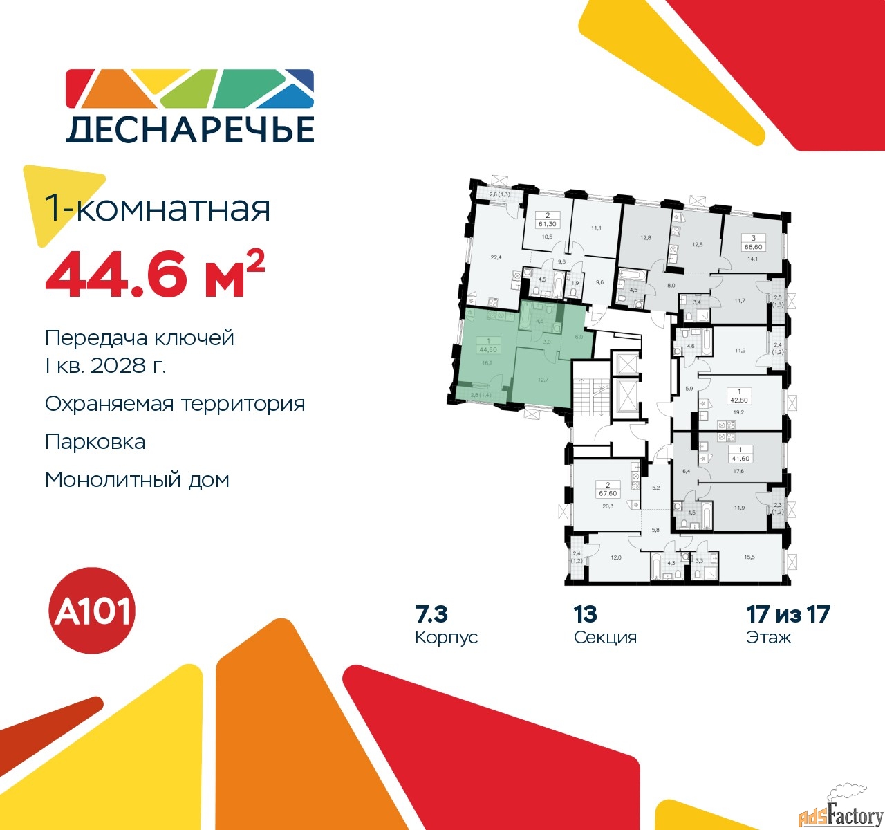 Дом монолитный, черырехподъездный, переменной этажности, от 9 до 17 этажей. Квартира находится в 3-й секции высотой 17 этажей в корпусе 7.3. На этаже 5 квартир. В подъезде 1 пассажирский и 1 грузовой лифт. Начало строительства - 2 квартал 2025 года. Окончание строительства - 1 квартал 2028 года. Оформление сделки по договору долевого участия.