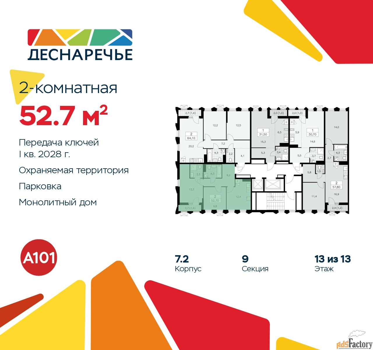 Дом монолитный, двухподъездный, высотой 13 этажей. Квартира находится в 1-й секции в корпусе 7.2. На этаже 5 квартир. В подъезде 1 пассажирский и 1 грузовой лифт. Начало строительства - 2 квартал 2025 года. Окончание строительства - 1 квартал 2028 года. Оформление сделки по договору долевого участия.