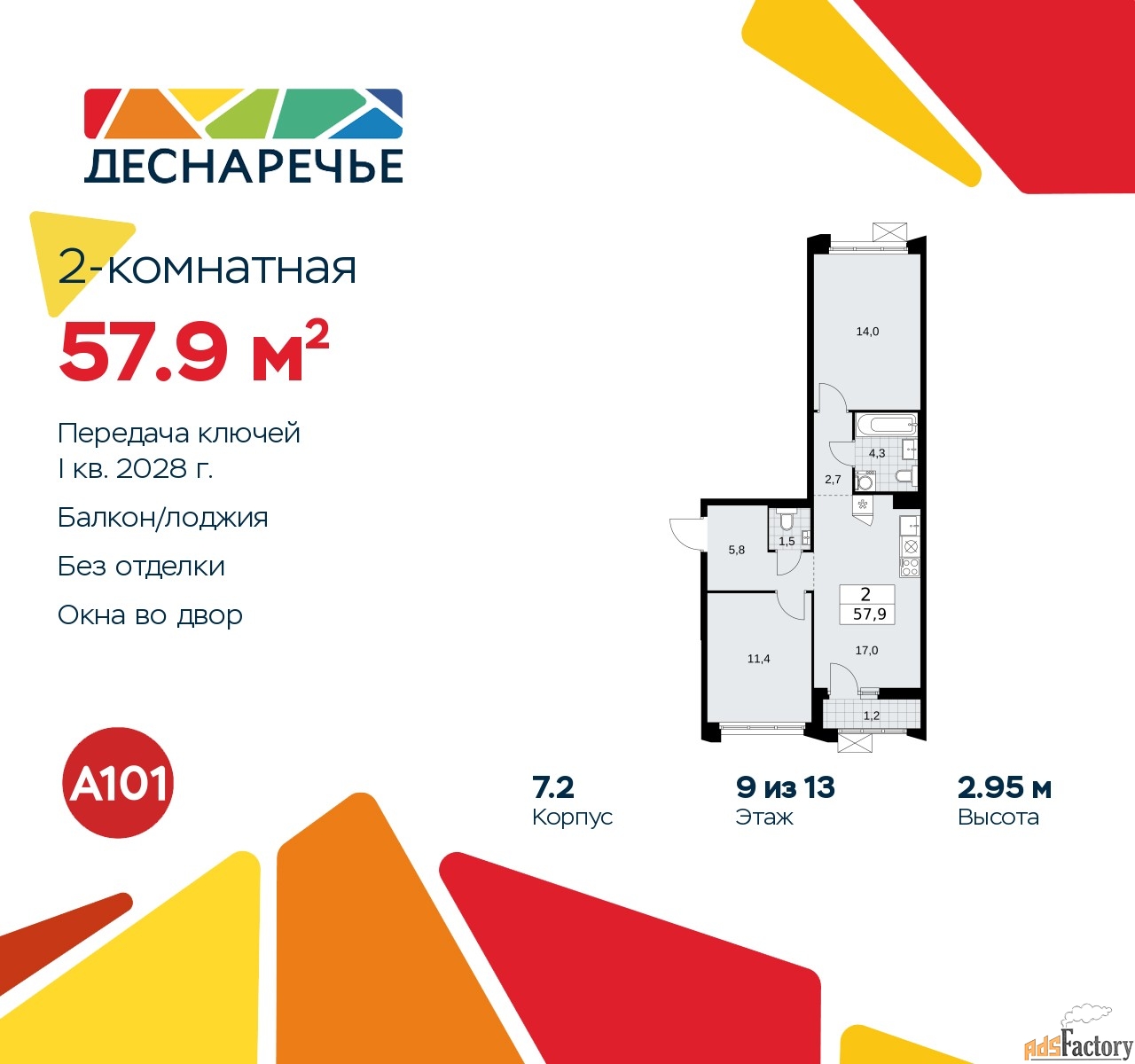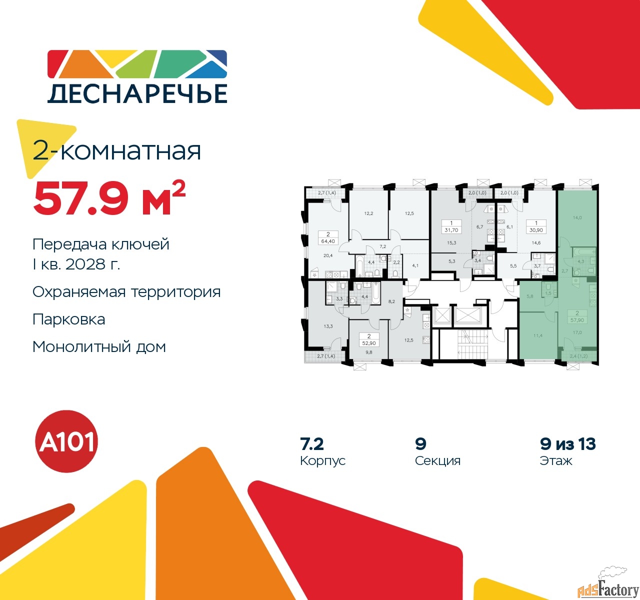 Дом монолитный, двухподъездный, высотой 13 этажей. Квартира находится в 1-й секции в корпусе 7.2. На этаже 5 квартир. В подъезде 1 пассажирский и 1 грузовой лифт. Начало строительства - 2 квартал 2025 года. Окончание строительства - 1 квартал 2028 года. Оформление сделки по договору долевого участия.