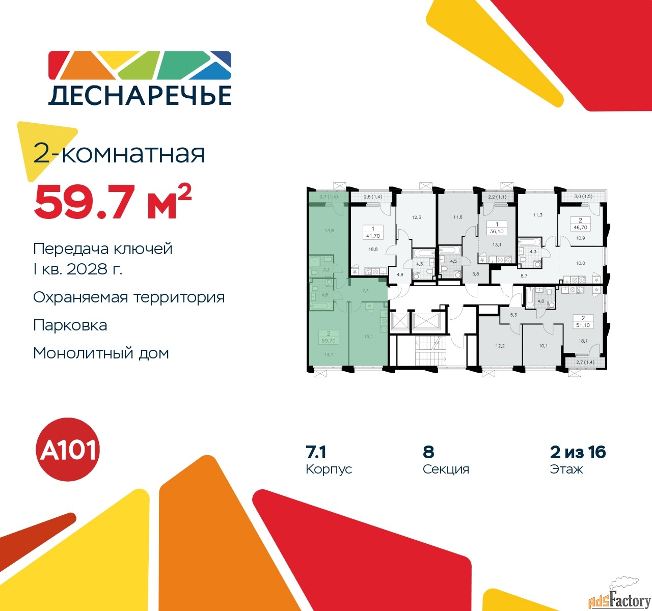 Дом монолитный, многоподъездный, переменной этажности, от 8 до 16 этажей. Квартира находится в 8-й секции высотой 11 этажей в корпусе 7.1. На этаже 5 квартир. В подъезде 1 пассажирский и 1 грузовой лифт. Начало строительства - 2 квартал 2025 года. Окончание строительства - 1 квартал 2028 года. Оформление сделки по договору долевого участия.