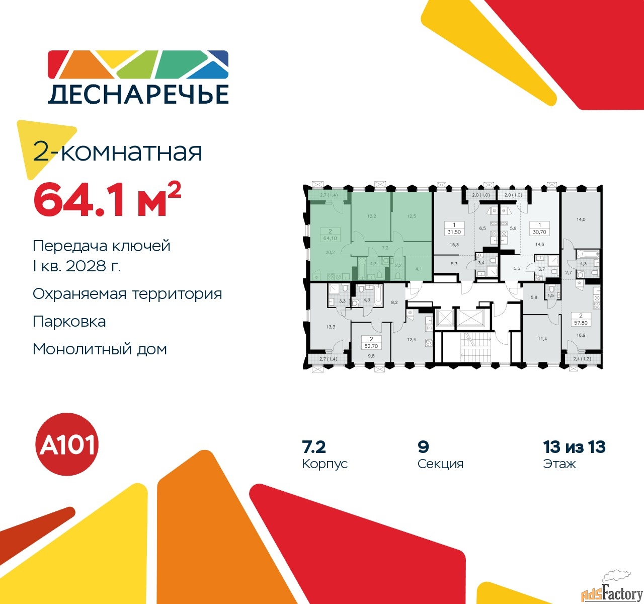 Дом монолитный, двухподъездный, высотой 13 этажей. Квартира находится в 1-й секции в корпусе 7.2. На этаже 5 квартир. В подъезде 1 пассажирский и 1 грузовой лифт. Начало строительства - 2 квартал 2025 года. Окончание строительства - 1 квартал 2028 года. Оформление сделки по договору долевого участия.